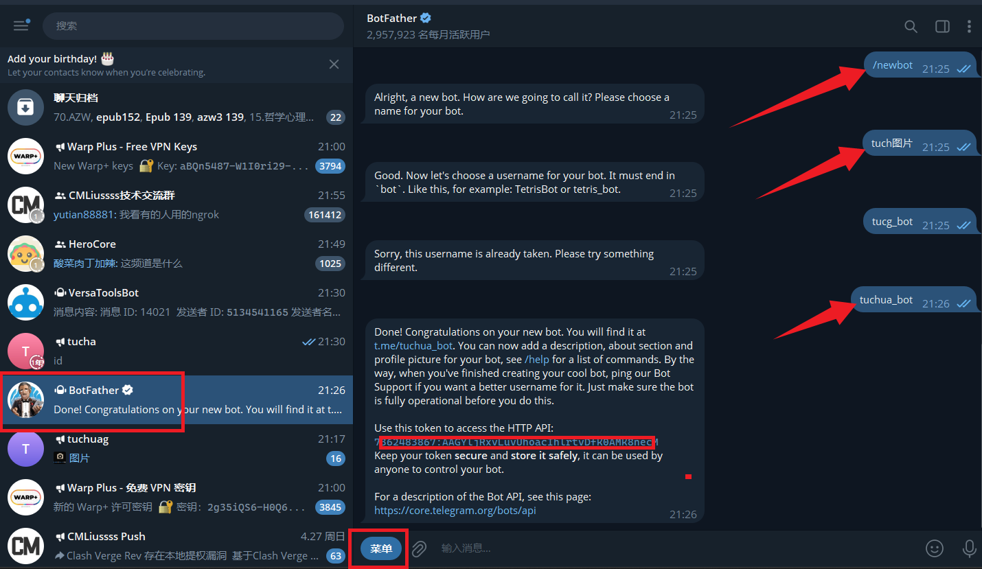 新建 机器人tuchua_bot 并获取 Token 即 :TG_BOT_TOKEN