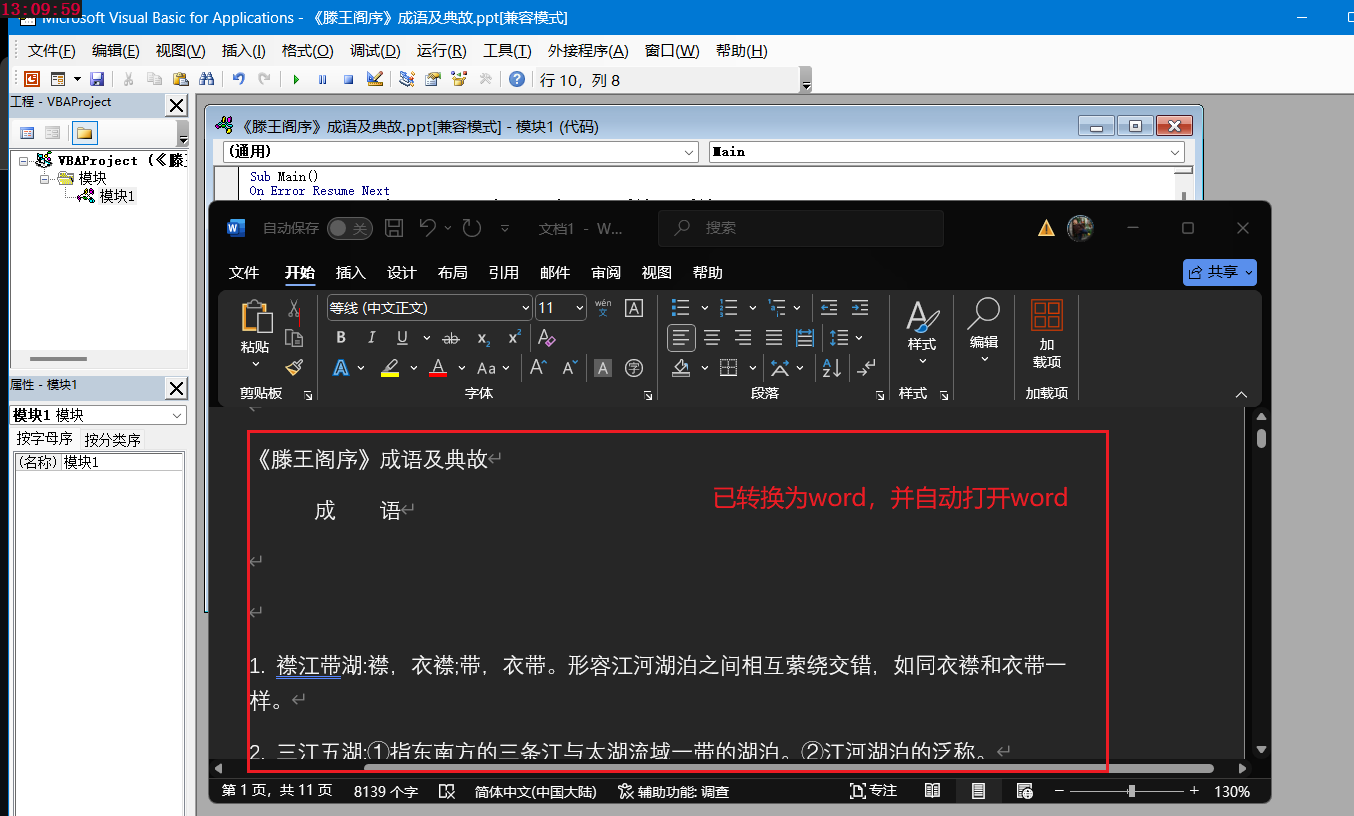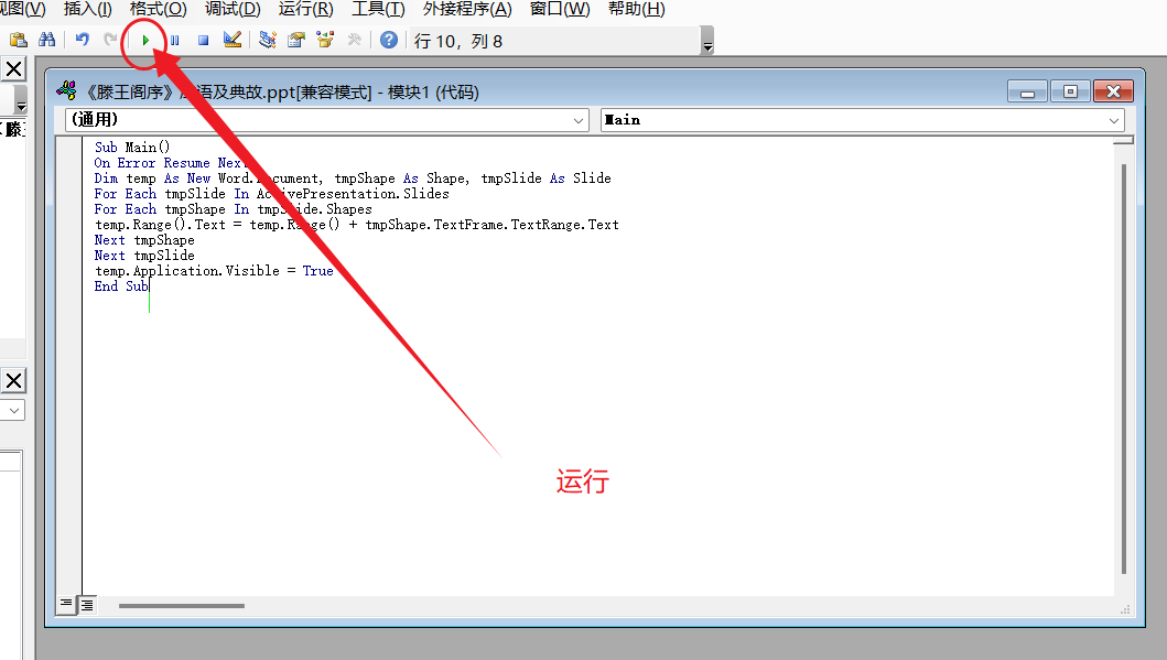 4、最后点击【运行】代码,或者按【F5】键,PPT就成功转换成Word了。